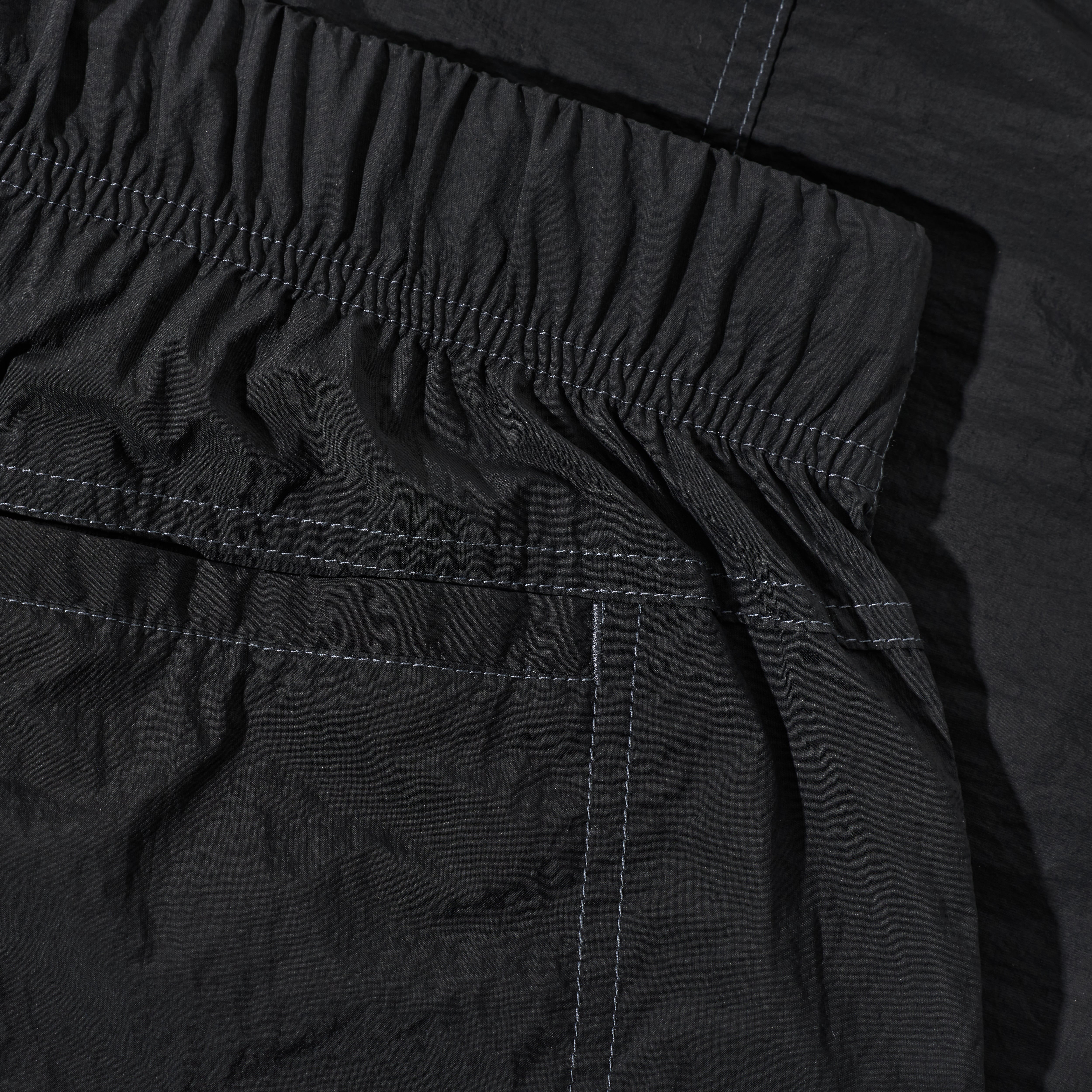中国 ナイロン100% / 85g / シワ加工 / ライトウェイト / コントラストスティッチ / 伸縮性ウエスト・プラスティックバックルアジャスター / 前パッチポケット / 隠しキーポケット・YKKジップ付き / バックヨーク / 刺繍ロゴ / ワイドフィット